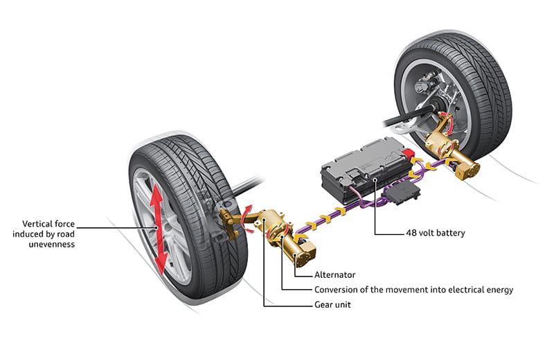 “Every pothole, every bump, every curve induces kinetic energy in the car. Today’s dampers absorb this energy, which is lost in the form of heat,” explained Stefan Knirsch, board member for Technical Development at Audi the principle behind eROT. “With the new electromechanical damper system in the 48-volt electrical system, we put this energy to use. It also presents us and our customers with entirely new possibilities for adjusting the suspension.”