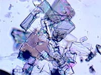 The metal-organic framework material at the center of a new discovery by chemists at the USF and KAUST is shown under a microscope. The crystals have been found to be a more efficient, less expensive and reusable material for carbon capture and separation, and is a promising breakthrough in developing better carbon-control technologies. Image: USF/Mike Zawortko.