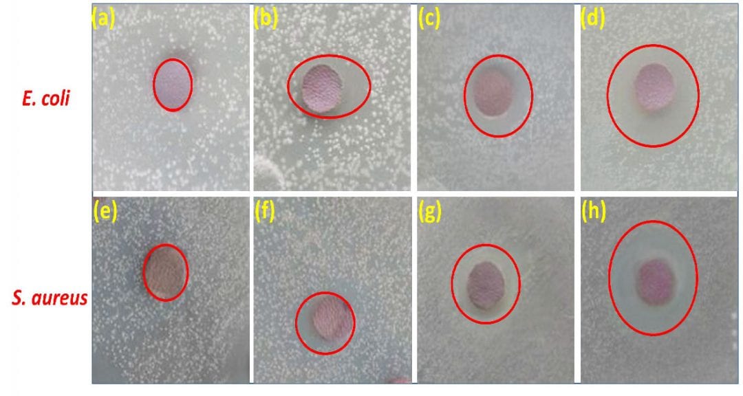 Bacteria-free zones around (a, e) pure leather, (b, f) chitosan-coated leather, (c, g) PEG-g-chitosan(4%)-coated leather, and (d, h) PEG-g-chitosan(8%)-coated leather.
