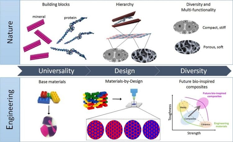Nature uses few universal building blocks to achieve unique functional properties and diversity through different hierarchical structures. With a similar approach, it is possible to use pure polymers as building blocks to investigate, through bio-inspired design and 3D printing, the effect of different geometries.