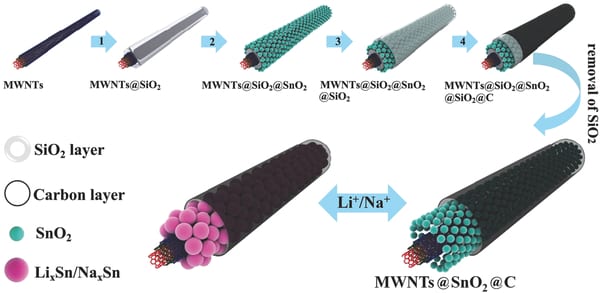 Recent work by Zhao et al., published in Advanced Science, discusses a novel hybrid morphology of SnO2 (tin oxide) as an anode material for lithium or sodium ion batteries. SnO2 has a high theoretical capacity and level of safety, but has been previously limited by low electrical conductivity and large volume changes. Zhao et al. designed and synthesized a new multi-walled carbon nanotube nanostructure containing SnO2 in order to enhance its electrical properties.