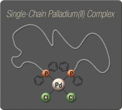 To address this void, a first example of metal-ligand interaction driven single chain self-folding is presented. The group of Christopher Barner-Kowollik (KIT, Germany) synthesized bistriphenylphosphine macroligands by a combination of controlled/living radical polymerization and modular ligation chemistry. In high dilution these bidentate macroligands form cyclic complexes with palladium(II) ions. The displayed fashion of folding single polymer chains can in the future be combined with other types of linkages, extended to other metal-ligand systems or even be a potential mimic of the active site of an enzyme.