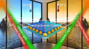 Thermochromic smart coatings are a clever means to control solar radiation subject to temperature changes. These coatings block infrared radiation (IR) at high temperatures while allowing it to go through at low ones.