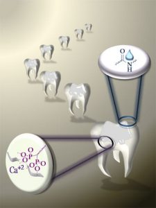 Modern ‘self-etching’ dental adhesives actually etch the enamel and dentin of the tooth to create a strong bond between composites and dental tissues. The main problem of modern dental adhesives is that, because water is an important ingredient in the adhesive itself, they can break down from constant exposure to the wet environment of the human mouth.